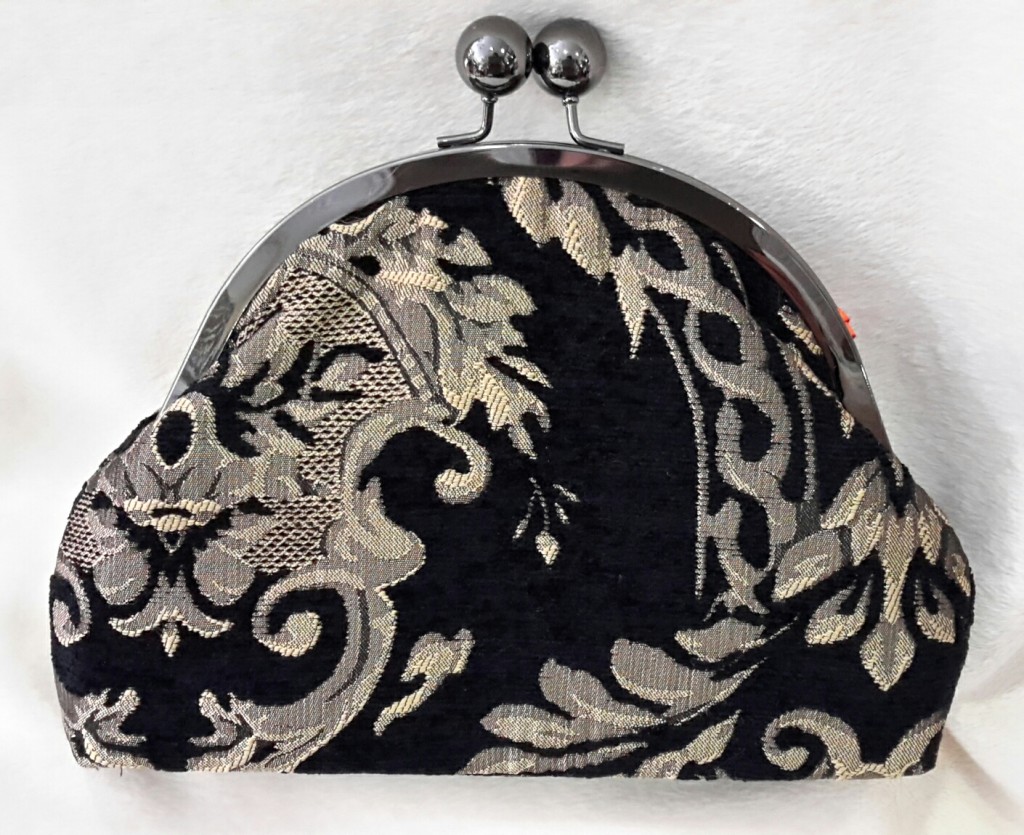 Bolso fiesta negro bordado oro, c/boquilla metal gris. Material textil y metal