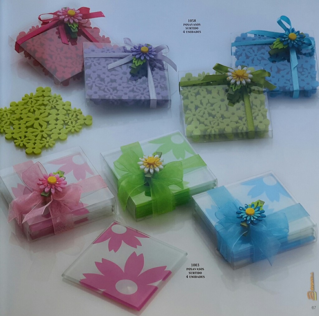 Ref 1003 Set 4 posavasos flores con caja, lazo y flor pinza stdo. pvp 2,40 €